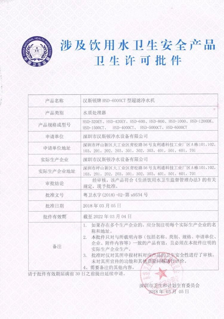 前段时日,汉斯顿HSD-6000CT型超滤净水机,包括HSD-320EY、HSD-420EY、HSD-600、HSD-800、HSD-1000、HSD-1200DK、HSD-1500CT、HSD-4000CT、HSD-5000CT、HSD-6000CT型号的净水器,已获得涉水批件。批准文号:粤卫水字(2018)-02-第S9534号