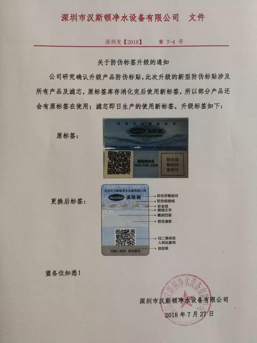 公司研究确认升级产品防伪标签,此次升级的新型防伪标贴涉及所有产品及滤芯,原标签库存消化后使用新标签,所以部分产品还会有原标签在使用,滤芯即日生产的使用新标签。