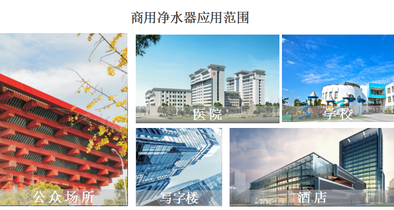 商用净水器主要作用于公共和商业场所,如政府机关、写字楼、医院、学校、餐饮店、酒店、机场等。