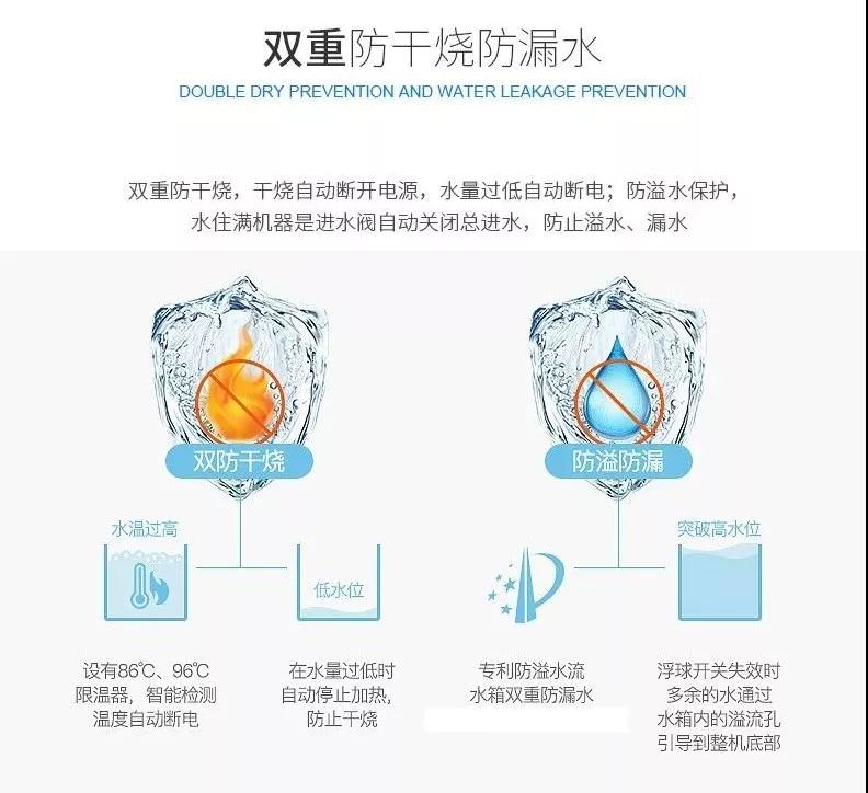 外表美观而内藏智慧,汉斯顿HSD-G07拥有双重防干烧防漏水功能,干烧自动断电,水量过低自动断电;水满时机器进水阀自动关闭,防止漏水;还有童锁设置,保障你和家人的饮水健康和安全。