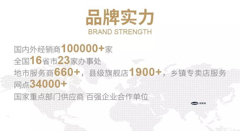 同时建有660+地市服务商,1900+县级旗舰店,34000+乡镇专卖店服务网点,覆盖中国多乡镇,为每一位客户提供真诚周到的服务。