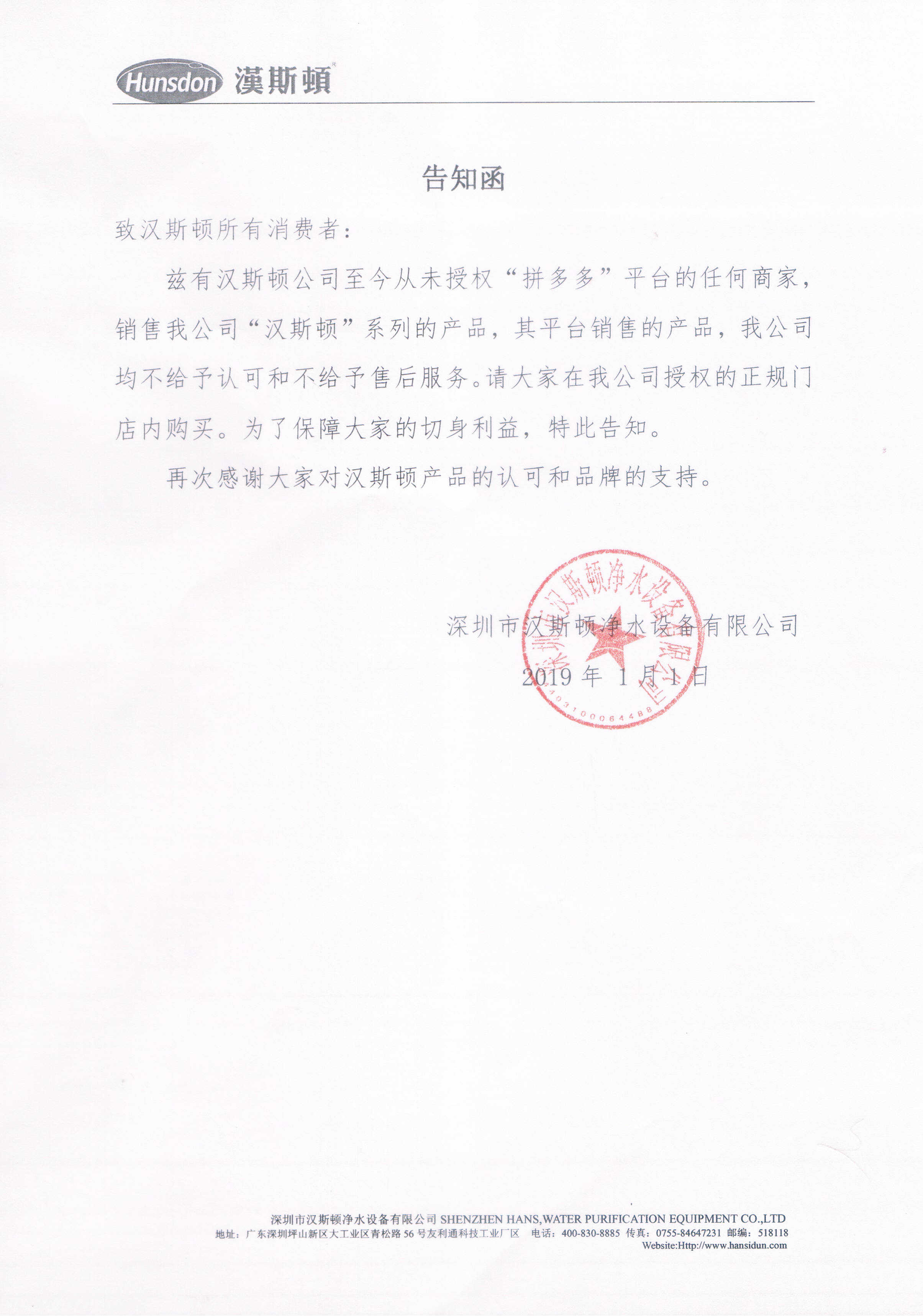关于汉斯顿未授权拼多多平台通知