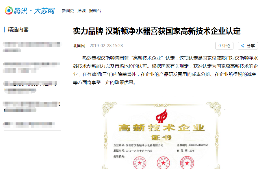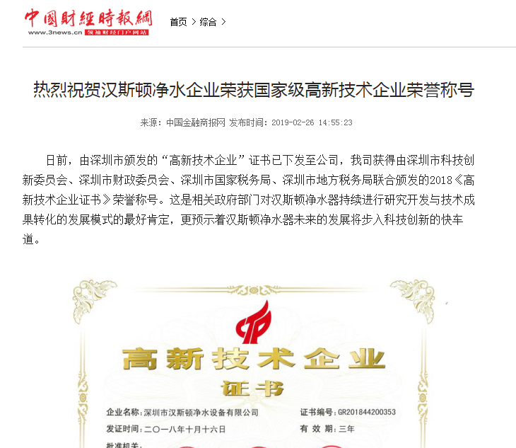 据了解,目前国内大大小小的净水器品牌数量超过五千个,品牌实力参差不齐,而获得高新技术企业荣誉称号的净水器品牌更是屈指可数,而随着汉斯顿净水器荣获高新技术企业称号之后将更加奠定其行业地位。
