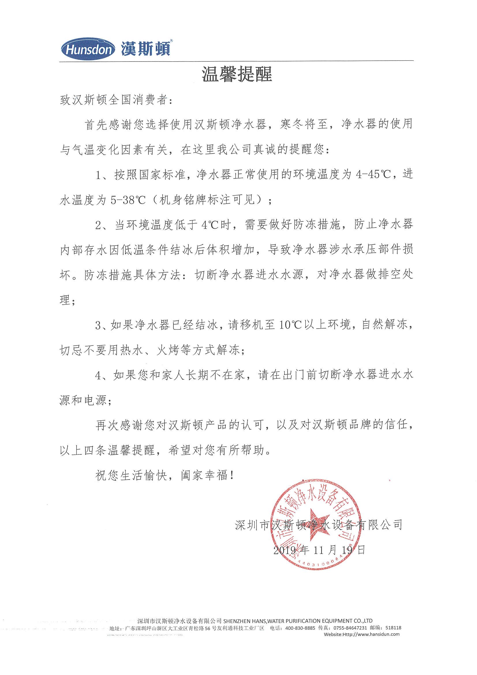 通知:关于汉斯顿净水器冬季使用事项提醒